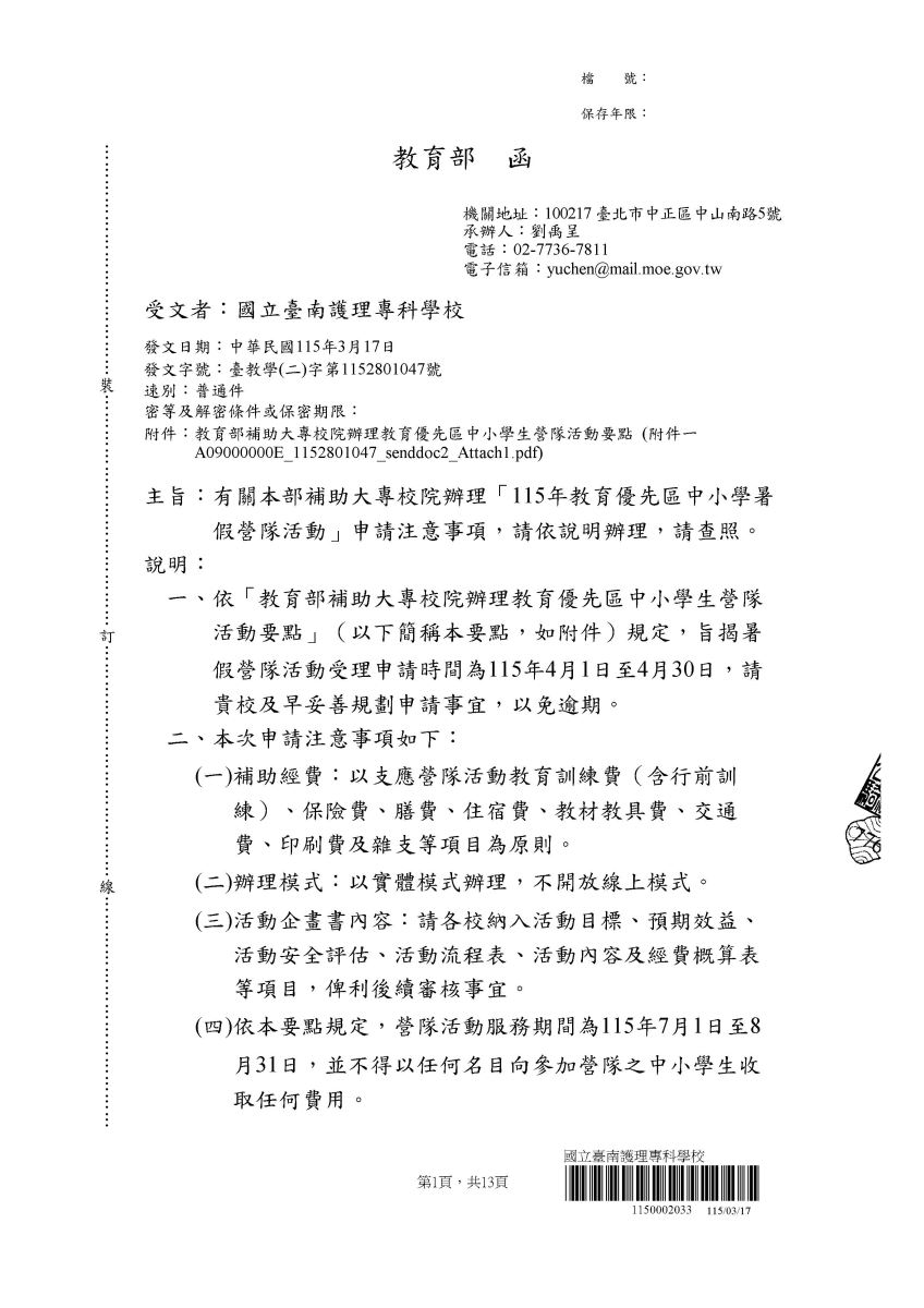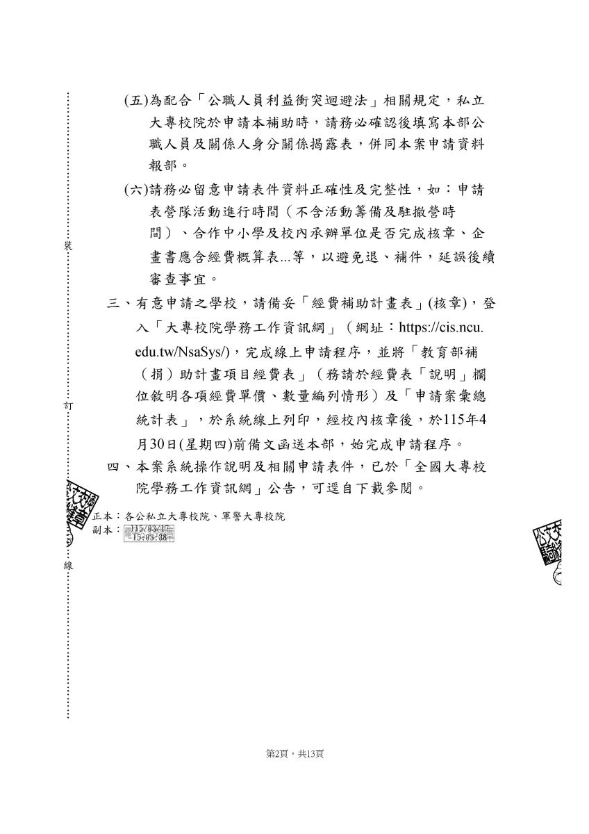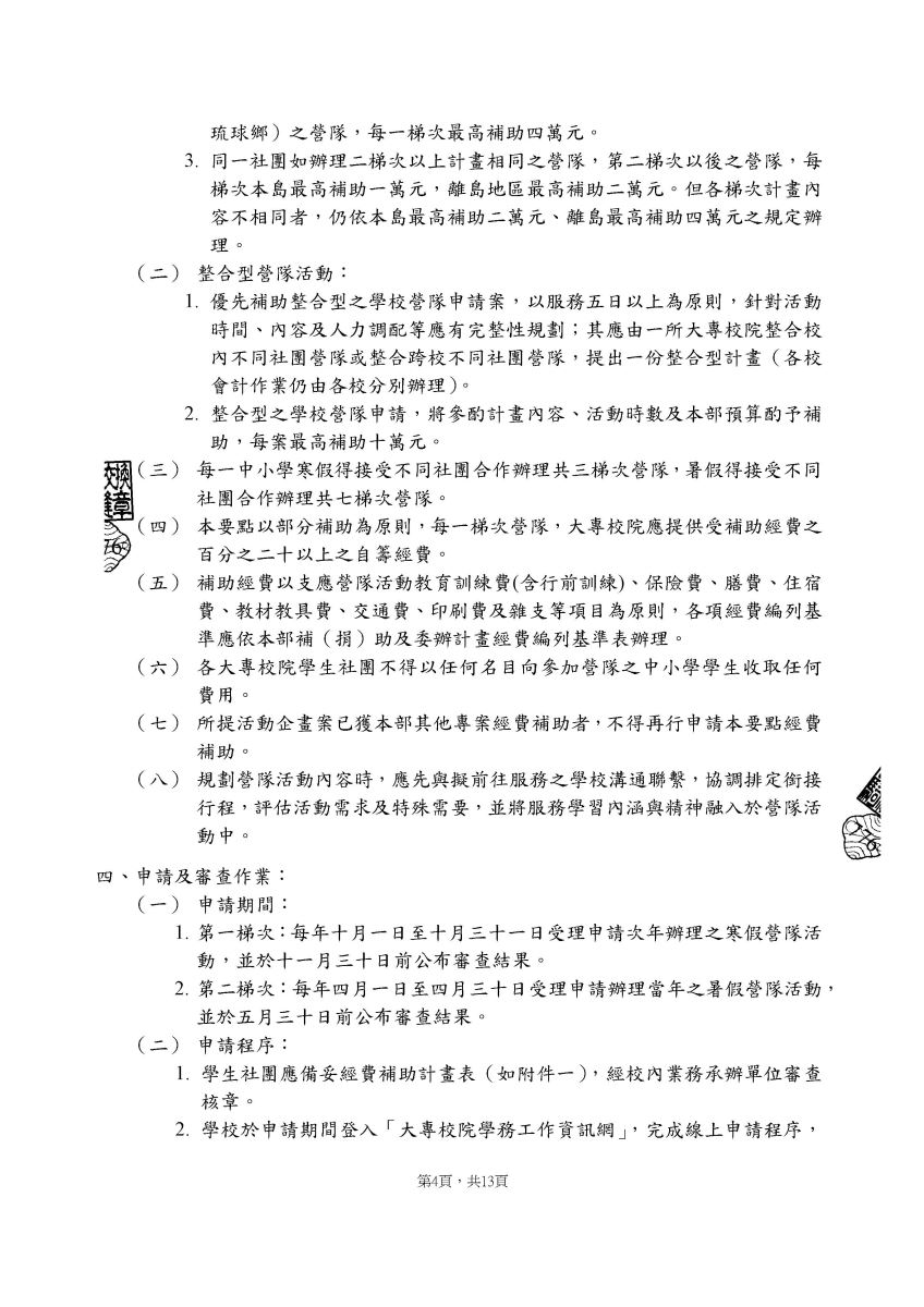 二、請各社團依「教育部補助大專校院辦理教育優先區中小學生營隊活動要點」相關規定辦理,詳情請見該要點第1頁、第2頁、第3頁及第4頁。