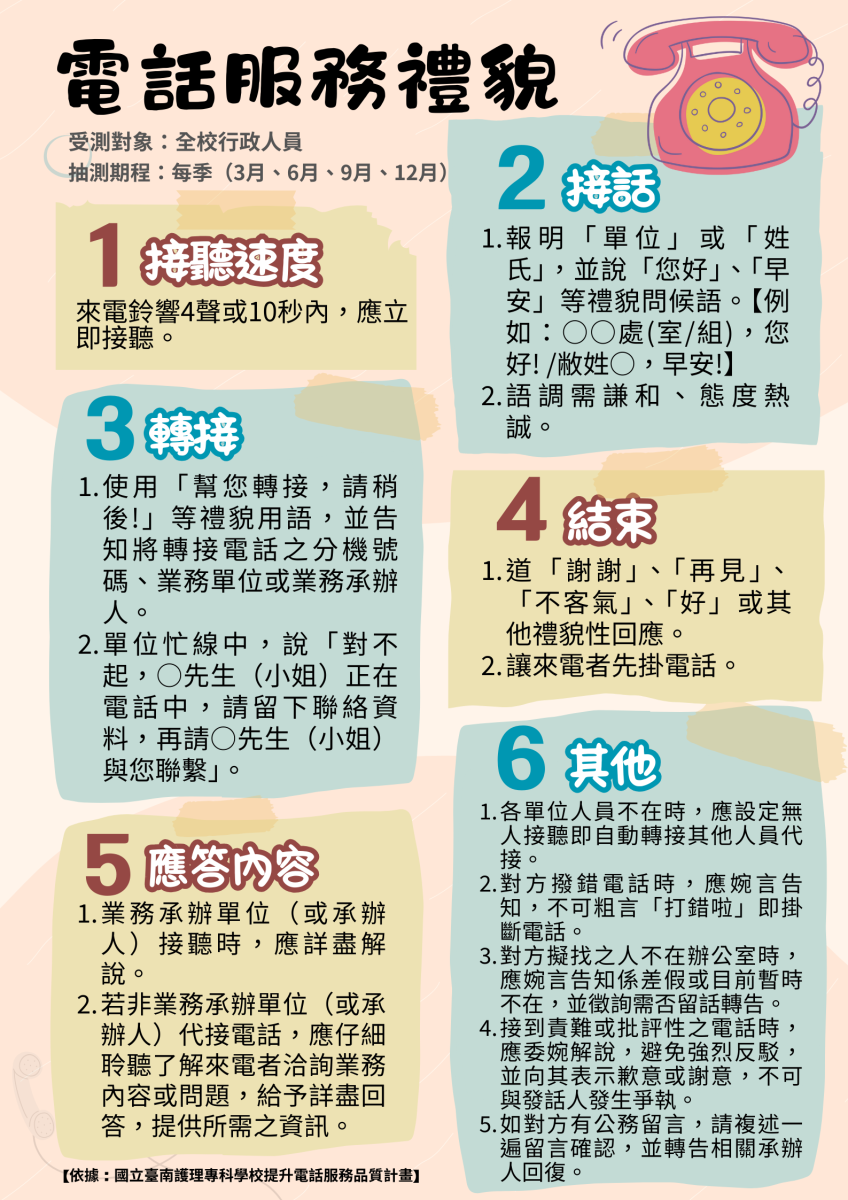 電話服務禮貌專區 114年12月4日校函 國立臺南護理專科學校提升電話服務品質計畫 國立臺南護理專科學校提升電話服務品質測試紀錄表 電話服務禮貌宣導海報 電話禮貌測試Q&A 上次更新時間:2025/12/8 下午 05:07:54 瀏覽次數:218